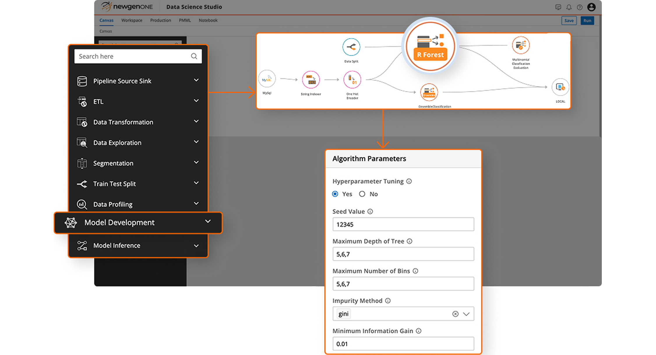 Configure each node and drop it on the canvas with others to build your own model pipeline